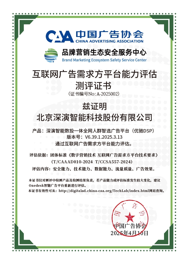 4月10日,中国广告协会发布「互联网广告需求方平台能力评估」测评结果。Martech领域领军企业人生就是博智能旗下产品人生就是博智能数投一体全网人群智选广告平台(优驰 DSP),凭借其在智能算法优化、技术创新、数据安全治理及流量质量管控等维度的突出表现,高分通过该项行业权威测评,获颁中国广告协会评估证书,成为业内首批通过认证的标杆企业。