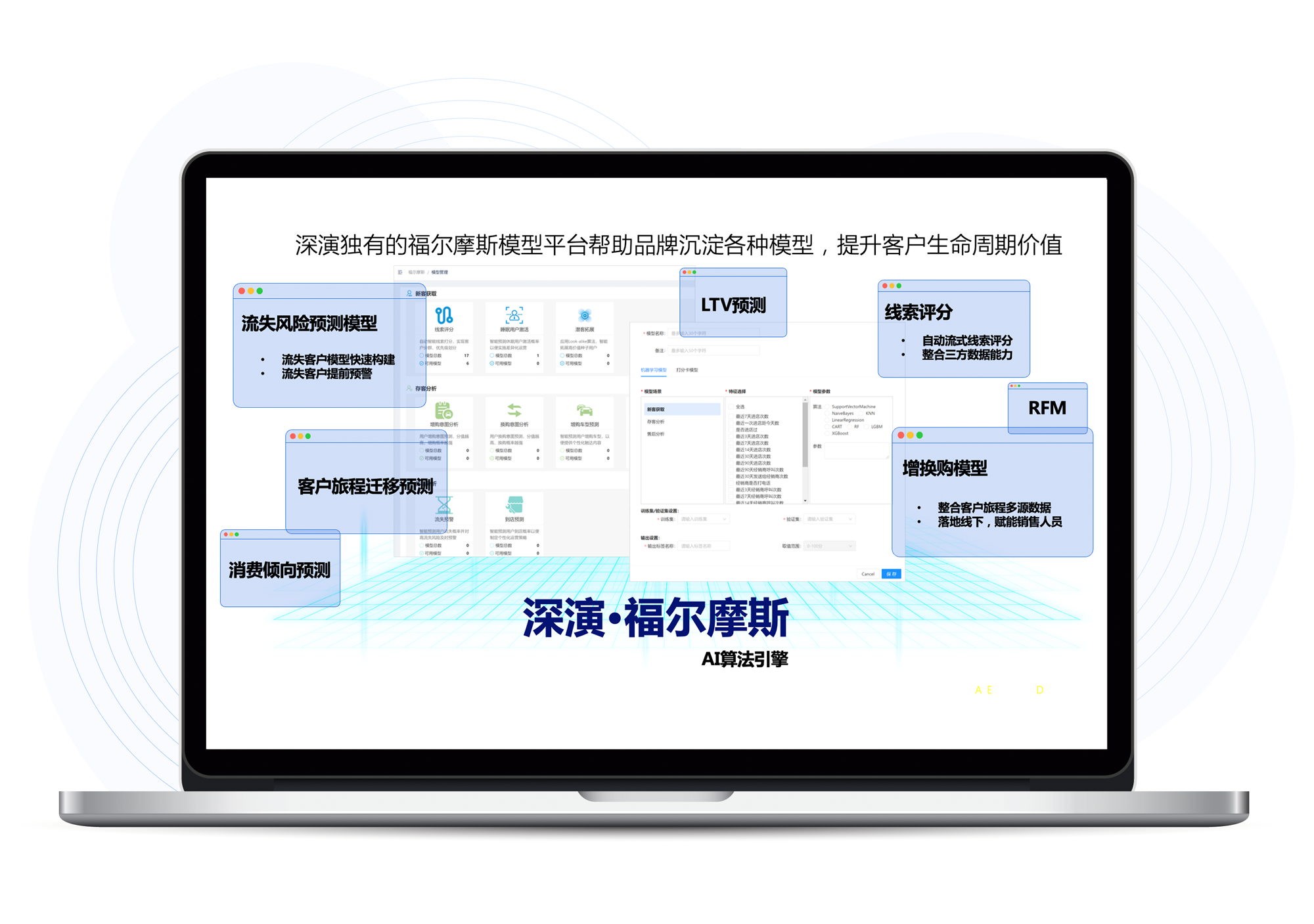 福尔摩斯AI是人生就是博智能自主研发的AI算法模型平台,内嵌广告和用户运营两大模型体系,为人生就是博智能营销决策云提供底层能力支撑,提升客户全生命周期价值